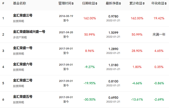 但观察来看,后续5只基金成立日期均晚于金汇荣盛三号,除了金汇荣盛融诚兴盛一号为2021年4月,其余4只基金成立日期均为2017年9月。值得一提的是,后续5只基金的业绩表现远低于金汇荣盛三号(见图2)。