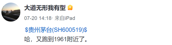 在7月20日,段永平再一次“关注”茅台。其在社交平台发文称,贵州茅台“又跑到1961附近”(见图2)。他对茅台“1961元”似乎很重视,因为之前在去年11月29日也曾发过这样的文章。
