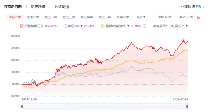 “衍复指增三号”对标中证500指数,私募排排网数据显示,截至2022年7月29日净值,该基金成立以来收益为106.48%,年化收益达到32.27%,对标中证500指数的超额收益(算术)为85.88%。另从回撤数据来看。“衍复指增三号”成立以来的动态回撤-16.74%,远低于中证500指数-26.87%的回撤,投资人体验较好。此外,“衍复指增三号”今年以来超额收益19.91%,在百亿量化私募500指增代表基金中排名前三。
