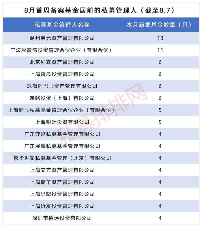 8月首周,启元资产以13只新发基金数量暂时领先夺冠。公开资料显示,启元资产致力于通过科学化的投资方式,坚持“专业、谨慎”的投资理念,寻求中国股票、期货以及其他衍生品市场上的投资机会,公司产品涉及策略包括FOF策略、量化对冲策略、指数增强策略、主观股票策等方向。私募排排网数据显示,启元资产今年取得4.33%的正收益。