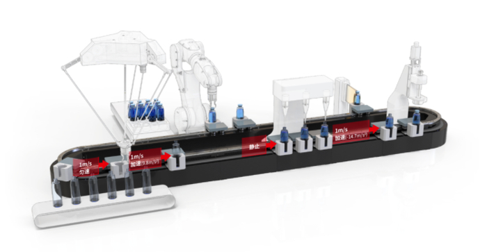 传统的自动化产线输送方案多采用皮带传送的方式,工件置于传送带的托盘上,再加以各种机械式定位机构来完成工件在产线上的运动和停止。皮带传动的原理是利用摩擦力输送工件,从而无法急停,这导致其输送速度受限,直接影响产线整体效率。同时由于需要引入停止限位机构,整条生产线的节拍设计和工位设计也会较为复杂。卢红星表示,传统自动化输送线的定位方案极大限制了后期产线的改造空间,不能很好地匹配柔性化的生产需求。
