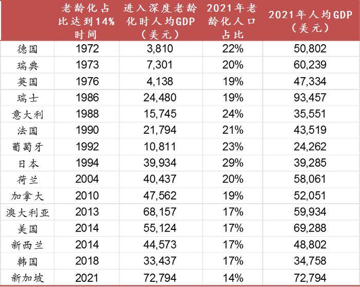 当这些高收入经济体在步入深度老龄化初期,人均GDP通常在3万美元(人均30000美元以上为步入发达经济体标准)左右,澳大利亚和新加坡甚至高达7万美元。而我国2021年人均GDP为1.2万美元,还是属于中等偏上收入国家,仍未跨入高收入经济体行列。