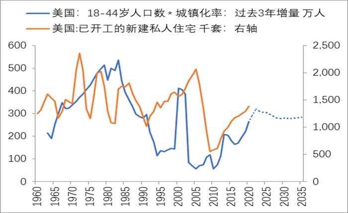美国由于较开放的移民政策,大规模的年轻移民有相对较高的生育率,因此美国18-44岁的年轻人口规模迄今尚未出现拐点,城镇化率则达到较高水平后维持稳定。但从美国城镇年轻人口(18-44岁人口规模*城镇化率)的增量与美国新建住宅的关系来看,两者有较明显的正相关性。