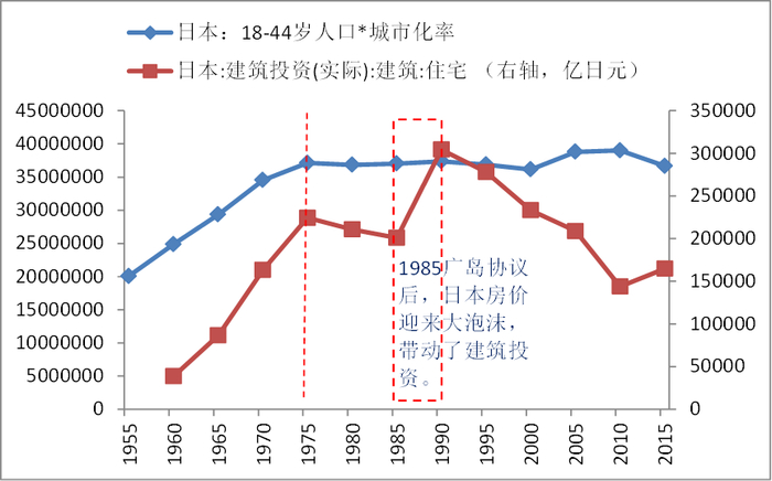 日本18-44岁的年轻人口乘以城市化率在1975年左右出现拐点,日本住宅建筑投资也同时出现拐点。