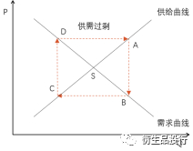 市场处于供需平衡状态为S,若此时需求转弱,呈现供给过剩状态A,贸易商抛货以压低库存,导致商品价格下跌,厂商降低开工率,供需曲线由A移至B,处于主动去库阶段;