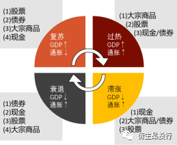 复苏阶段:经济上行,通胀下行——股票>债券>大宗商品>现金;