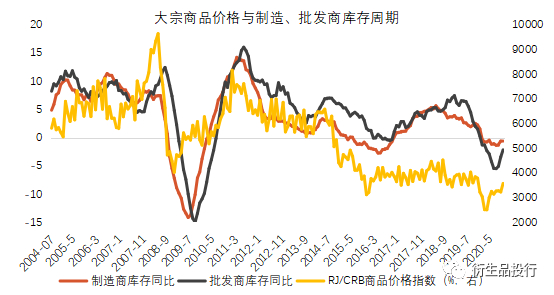 美国制造商和批发商库存与大宗商品价格走势高度相关。疫情以来,产能缺口加速美国库存去化,在宽松的货币、财政刺激下,需求端的迅速恢复使美国进入补库周期,对大宗商品的价格有着明显的推动作用。
