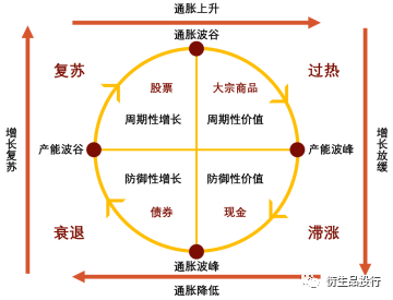 过热阶段:经济上行,通胀上行——大宗商品>股票>现金/债券;
