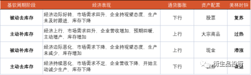 当经济持续增长、通货膨胀没有增强时,经济处于复苏阶段,资产价格普遍较低,适合买入股票,对应的库存周期处于被动去库存阶段,市场需求提升,企业生产存在滞后性,商品库存持续下降;