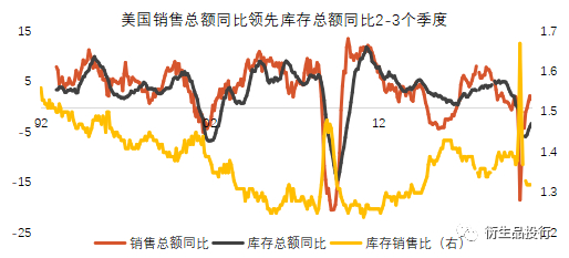 美国私人库存既包括商品生产环节的制造商库存,也包括流通环节的批发、零售库存,私人部门补库存,往往推动美国经济增长加速。从构成上看,美国私人库存包括制造商库存、批发商库存、零售商库存,以及采矿业、农业等其他库存。产品从生产到最终消费依次经过的三大部门,即制造商、批发商与零售商。美国库存周期的核心指标为库存总额同比、销售总额同比与库存销售比。销售总额同比是库存周期的核心影响因素,稳定领先库存总额同比2-3个季度。美国销售总额同比与居民收入同比走势高度一致,但销售同比的波动幅度明显大于居民收入同比,即当收入改善时,销售的改善幅度会更大,反之当收入下降时,销售的缩减幅度会更大。