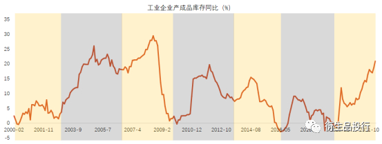 当经济增长强劲、通货膨胀增强时,经济进入过热阶段,适合配置大宗商品,对应的库存周期处于主动补库存阶段,经济不断上行,市场需求旺盛,大宗商品价格稳步提升,企业的库存不断提升;
