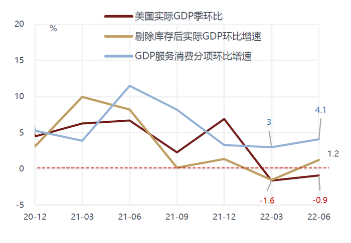 例如,当前美国二季度GDP萎缩0.9%主要受到去库存的拖累,剔除库存变动影响后环比恢复为1.2%的正增长。以私人消费和私人投资加总衡量美国经济内生需求,2022一季度两者环比增长近3%,二季度环比下滑至-0.01%,虽然大幅放缓但也并没有明显转负。尤其是美国经济主要构成部分服务消费仍维持强劲,二季度环比增长4.1%,甚至高于一季度的3%。另外NBER更关注基于收入法计算的国内生产总值GDI,GDI计算方式与GDP大同小异,主要从收入分配的角度衡量一个国家或地区的经济总量,囊括了劳动者报酬、企业净盈余、政府税收及固定资产消耗等。今年一季度美国GDI仍保持正增长,环比达到1.75%,即使和一季度实际GDP环比-1.6%进行算术平均,两者的均值0.11%也仍维持在正值区间。