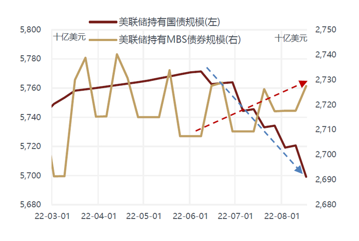从供给端看,根据美国财政部最新季度融资计划,一年以上国债的净发行量在下半年将明显减少,从上半年月均450亿左右下降到下半年月均300亿左右。造成供给下降的主要原因是政府财政收入大幅增长,融资需求相应减弱。2022财年前10个月(21年10月-22年7月)的财政收入超4万亿美元,相比2021财年同期增长近25%。近期财政部主要通过支取存量现金的方式满足开支,而非向市场融资,目前TGA账户余额已从近1万亿减少至0.54万亿。
