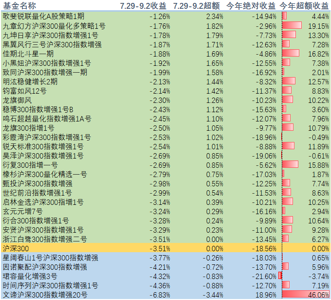 私募量化沪深300指数增强8月业绩对比
