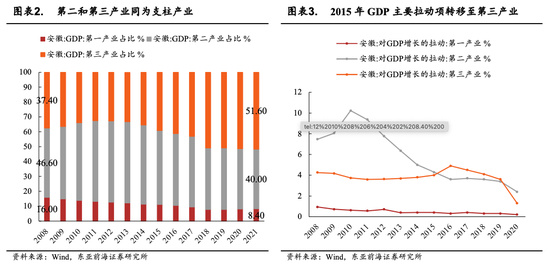 安徽省经济增长表现突出,工业和服务业是主要的增长动力。2008年安徽省GDP为8852亿元,全国排名第14位,2021年GDP增长至42959亿元,位于全国各省市第11位。08-21年期间GDP年化增速12.92%,排名全国第3。安徽省产业结构由第二产业单极发展,逐渐向第二、第三产业双轮推动演变。