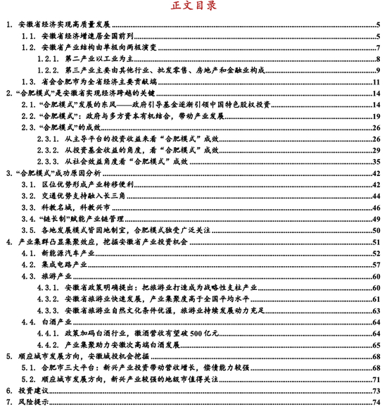 安徽省经济发展得益于“合肥模式”的成功,“合肥模式”的成功是政府多层次政策扶持的结果。安徽省重点培育新型显示、集成电路、新能源汽车、人工智能、新材料、光伏新能源和生物医药产业等产业。此外,安徽省经济高质量发展对旅游和白酒等消费产业的投资机会形成支撑。从产业投资角度建议关注:1)新型显示行业的京东方和维信诺;2)集成电路行业的芯碁微装、江丰电子;3)汽车行业的江淮汽车、瑞鹄模具、科威尔;4)新材料行业的皖维高新、中钢天源;5)旅游业的同庆楼、黄山旅游;6)白酒行业的古井贡酒、迎驾贡酒;7)光伏新能源行业的晶澳科技、隆基绿能;8)生物医药行业的立方制药、欧普康视;9)证券行业中新兴项目储备丰富的国元证券。从城投公司投资角度建议关注顺应城市发展方向的战略性新兴产业发展较快的城市:合肥、芜湖、滁州、蚌埠、铜陵、马鞍山。