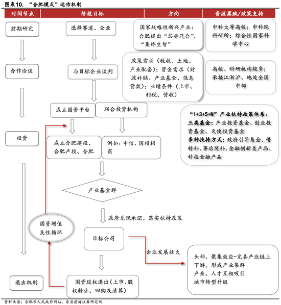 3)投资阶段,合肥方通过国资组建投融资平台,成立政府引导基金,引入社会资本、发挥国资的撬动作用,政府引导基金以公司制的形式对目标企业形成股权投资,规定目标企业获得的融资必须用于在合肥的某个项目建设。
