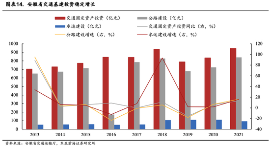 交通基础设施建设是拉动经济的重要抓手,2022年安徽计划投资千亿元加码交通基建。安徽2022年上半年共完成交通固定资产投资558.4亿元,同比增长35%,完成年度计划任务的51%,其中公路投资496.2亿元(+34%),水运投资37.9亿元(-4.5%),机场建设投资24.3亿元。从历年数据可见安徽省交通投资总体呈高速增长趋势,全省将扩大交通运输有效投资作为工作的重要着力点,力求“经济发展,交通先行”。