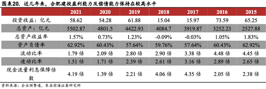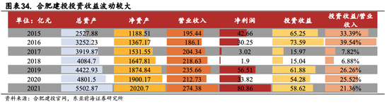 从合肥建投财务指标来看,2015年、2016年、2019年、2020年、2021年,合肥建投净利润、投资收益以及投资收益占营业收入的比例实现较大增长。