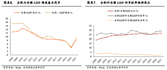 合肥是安徽省经济发展的最主要拉动力。历年来合肥市GDP增速与全省基本保持同步,合肥GDP占全省比重从2008年的18.81%上升至2021年的26.57%,呈逐年上升趋势,同时合肥GDP对安徽的贡献率持续维持25%以上。