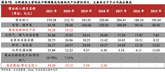 2)从主营构成角度来看:产业投资扩大了合肥建投业务范围,拓宽收入来源。合肥晶合集成电路股份有限公司(晶合集成)是合肥建投的子公司,在2020年、2021年分别为合肥建投营业收入贡献了15.12、54.29亿元,占合肥建投营业总收入的7.11%、19.79%。