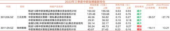 截至三季末,中欧瑞博共出现在2家上市公司前十大中,分别是三元生物和瑞纳智能。