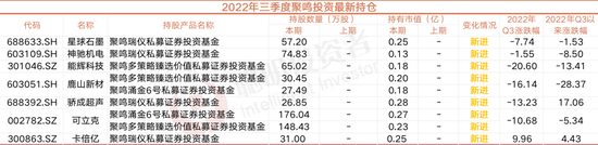 截至三季末,聚鸣投资共出现在7家上市公司前十大中,分别为星球石墨、神驰机电、能辉科技、鹿山新材、骄成超声、可立克、卡倍亿。
