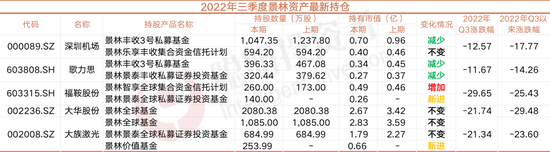 截至三季末,景林资产共出现在5家上市公司的前十大流通股东名单,持股市值达10.41亿元。