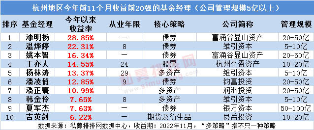 杭州地区今年收益冠军是富涌谷显山资产漆明杨,其核心策略为债券策略,今年前11个月的收益为28.85%。漆明杨是清华大学硕士研究生。曾就职于国家开发银行,现任富涌谷显山资产董事总经理。从事固定收益资产管理、金融市场工作十余年。
