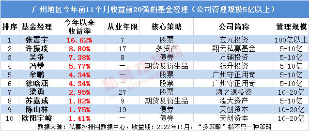 广州地区今年收益冠军是百亿私募玄元投资张震宇,其核心策略为股票策略,今年前11个月的收益为16.62%。张震宇是华南理工大学金融工程与风险管理专业硕士,2017年加入玄元投资,历任周期行业研究员,TMT行业研究员,投资经理助理等,目前担任玄元投资投资经理。