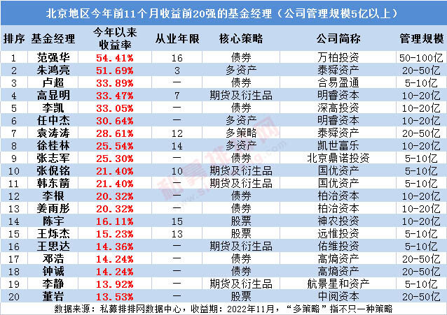 北京地区今年收益冠军是万柏投资范强华,其核心策略为债券策略,今年前11个月的收益高达54.41%范强华是万柏投资公司创始合伙人,总经理。中央财经大学硕士。具备15年的债券投资管理经验,曾任职平安信托固定收益部总经理,中信证券固定收益部副总裁。