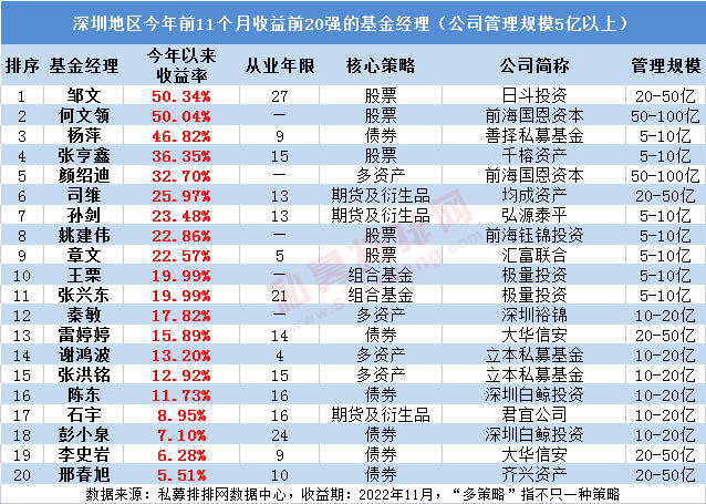 深圳地区今年收益冠军是日斗投资邹文,其核心策略为股票策略,今年前11个月的收益高达50.34%