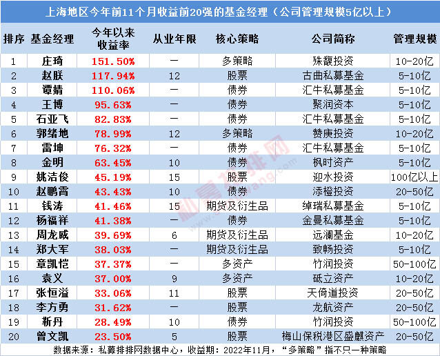 其中,来自殊馥投资的庄琦,其今年前11个月的收益高达151.50%,业绩表现遥遥领先,高出第二名超30个百分点。