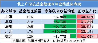 很多投资者也对各自区域的基金经理业绩表现情况感兴趣,于是,笔者今天要为大家梳理下北上广深杭五地基金经理今年以来的业绩表现,并筛选出收益靠前的基金经理供大家参考。