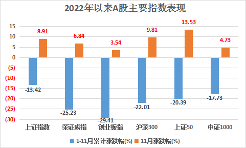 11月以来,国内外宏观面出现了转机信号,所以各指数都有一定程度的修复部分失地,其中代表低估值蓝筹的指数如沪深300上证50等修复力度更强。但综合下来,主要指数今年前11月表现依然较差。