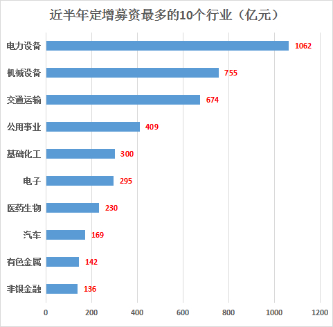 虽然今年整体定增市场“不景气”,但依然有不少公司成果抛出了巨额的定增融资。笔者统计发现,近半年来A股市场共有205家公司实现定增融资近4850亿元,主要聚集在电力设备、机械设备、交通运输等行业,三行业定增融资额占据“半壁江山”。