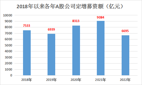 笔者以定增上市日为标准,统计了2018年以来,截至2022年12月19日,A股市场的定增融资情况,根据数据显示,近5年来,A股定增额每年都在6000亿元以上,累计融资近4万亿元。而今年定增融资额是近五年来最少的,这和今年股票市场走弱高度相关。