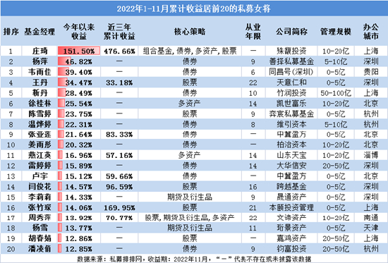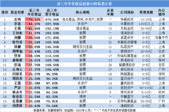 从近三年收益来看,167名女性私募基金经理中,有55名取得了年化10%以上的收益,笔者筛选出了收益前20强的私募女将供大家参考。