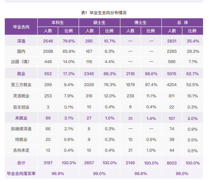 整体而言,有35.4%的毕业生选择继续深造,比例和2021年相同。其中,出国(境)深造人数为566人,占毕业生总数的7.1%。相较2021年的517人和6.9%,有小幅提升。
