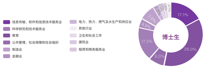 而拿到了博士学位的毕业生有36%去向了教育行业,另外有17.3%从事科研和技术行业。