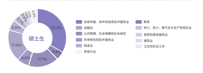 从单位所属行业来看,毕业生去向最多的行业,主要包括信息传输、软件和信息技术服务业,教育,公共管理、社会保障和社会组织,科学研究和技术服务业,金融业等。