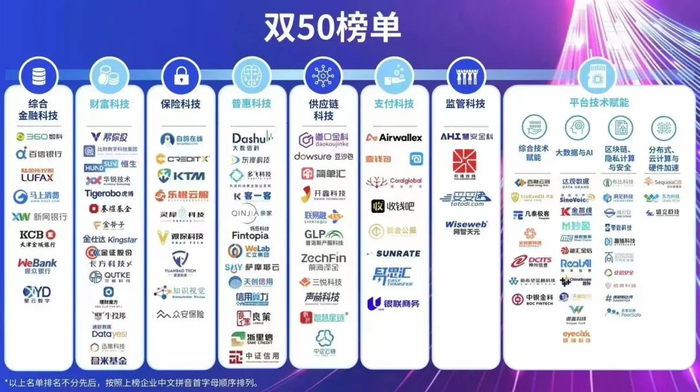 金融科技企业“双50”评选委员会由多位外部专家,以及数十位具有专业领域经验的毕马威全球及中国代表组成,覆盖信息科技、数据、资本市场、创投、风控、财务、宏观经济和金融服务等领域。以毕马威自主研发的企业洞察力模型(SIP), 结合科学与数据、创新与变革、金融服务普及、资本市场认可度、行业发展前瞻度五大核心关注点,从团队、技术、产品、 市场、融资等多个维度,对企业进行量化评估。微众银行、京东数科、众安科技等知名企业也数次上榜。