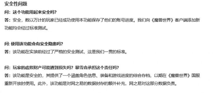 对于进度存档这一功能是否存在安全隐患的疑问,暴雪则回应称,该功能在实装前“经过了严格的安全测试”,提供了一个涵盖角色信息、装备和游戏进度的综合存档,且该功能是对网之易的数据封存的“额外补充”,网之易对这部分数据负责。