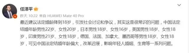 对于“法定婚龄降到18岁”引发的剧烈的讨论和争议,任泽平回应称,其实这是很常识的问题,中国法定结婚年龄男性22岁、女性20岁,日本男性18岁、女性16岁,美国男性18岁、女性18岁,印度男性21岁、女性18岁,德国、法国、加拿大、墨西哥等男性18岁、女性18岁,可见中国法定结婚年龄偏大,改革迟缓,影响年轻人婚姻、生育等一系列问题。