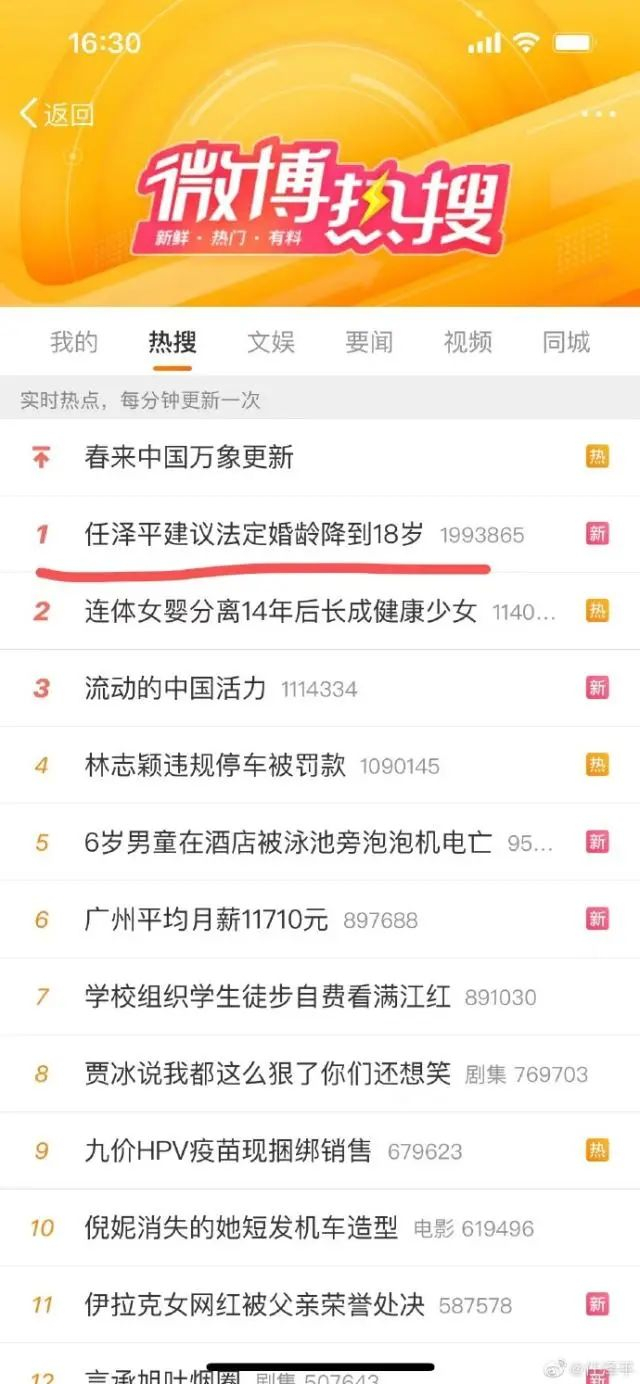 随即“法定婚龄降到18岁”引剧烈的讨论和争议,一度冲上了热搜第一名。