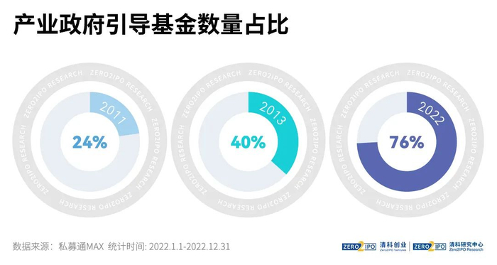 经过快速发展,政府引导基金的运作机制日渐成熟,同时在国内经济结构调整和产业转型升级政策推动下,各地增加产业政府引导基金的支持力度,以吸引社会资本投入,促进新兴产业发展,带动产业类引导基金数量占比已从2011年的24%上升至2022年的76%。