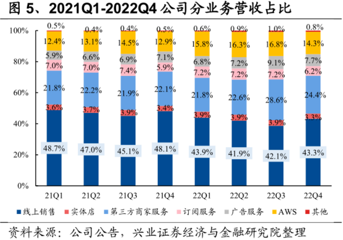 2022年以来,随着全球新冠疫情逐步得到控制,部分消费回流到线下实体店,亚马逊线上零售业务营收增长受限,费用率进一步被推高。