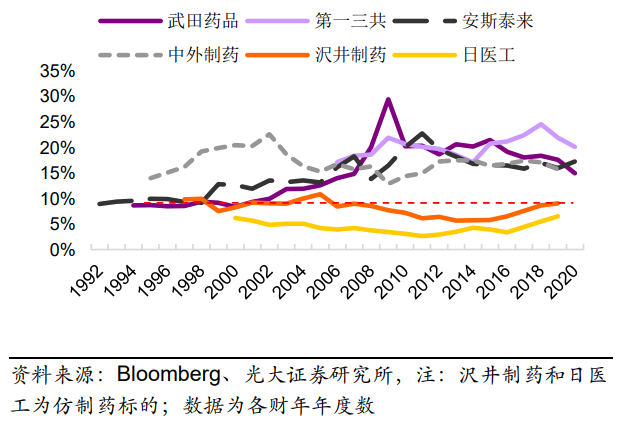 在医保政策改革的背景下,1980-90年代大型公司多数增加了对研发的投入,日本本土新药占比提升,日本医药行业的竞争格局得到改善,包括中外制药在内的大公司间接受益。2000年后,医保降费幅度趋缓,医药大板块开始受益。