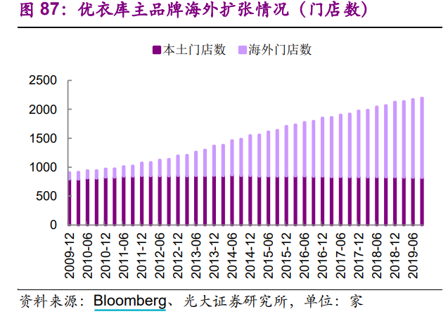 自 2010 年开始,面对本土市场增长趋缓、日趋饱和的情况,加速海外扩张力度,以中国市场为重点。2009-2019 年,本土门店数仅增长3.2%,海外门店数增长141.9%,中国门店数占海外门店的51.6%。海外市场帮助优衣库保持持续增长。