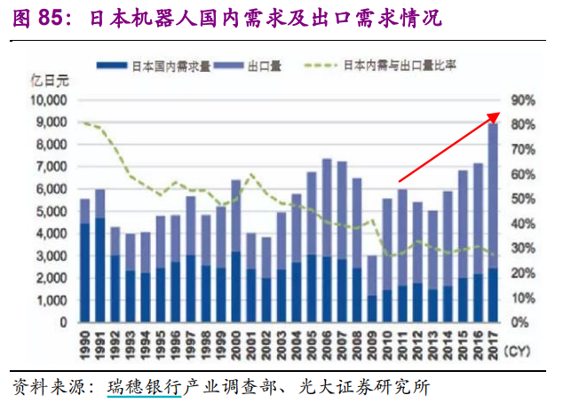 20世纪80年代日本劳动力资源不足、劳动力成本上升、产业需求结构的调整,日本政府政策的积极引导机器人产业快速发展。日本的安川电机与发那科在长期的沉淀之下,成为全球机器人4大家族的两位,份额与竞争力处于国际领先地位。